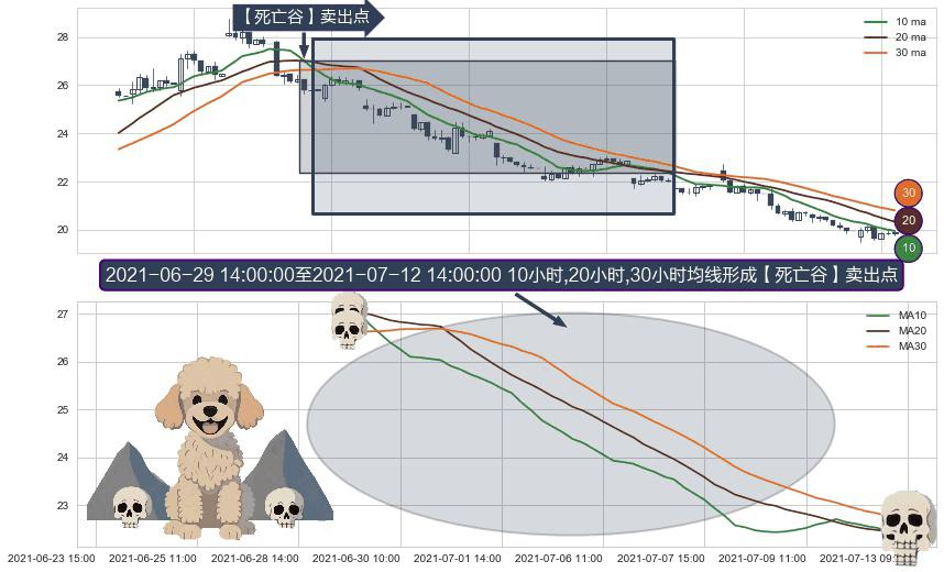 ⚀ 2021-06-29 15:00:00-小时至2021-07-12 14:00:00-小时显现 10小时-20小时-30小时均线 【死亡谷】卖出点 看空信号,后市看跌,卖出