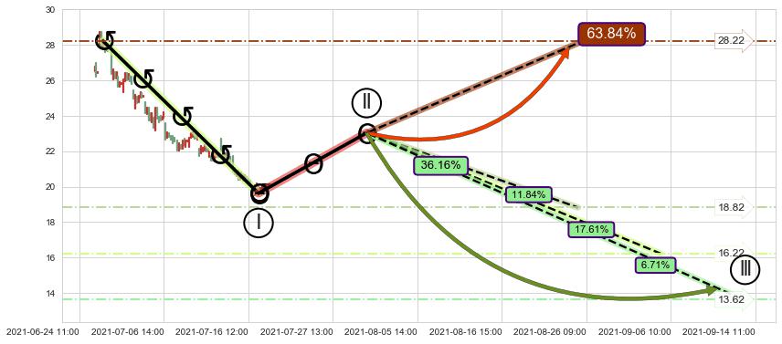➢ 循环浪继续向下【最低】位置(09-14:11, 13.62),匹配聚类样本比例18.55%, 可能性概率6.71%