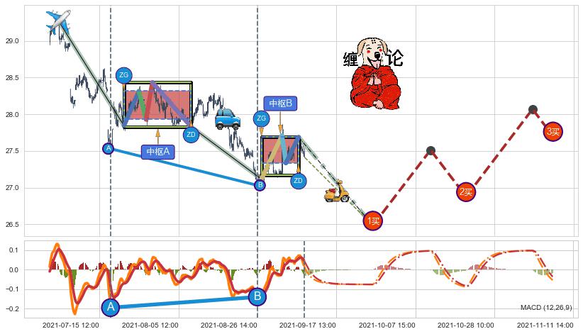 ➢ 【中枢B】:08-27:13-09-08:13,中枢由4笔构成,共48交易小时, ZG=27.69, ZD=27.34