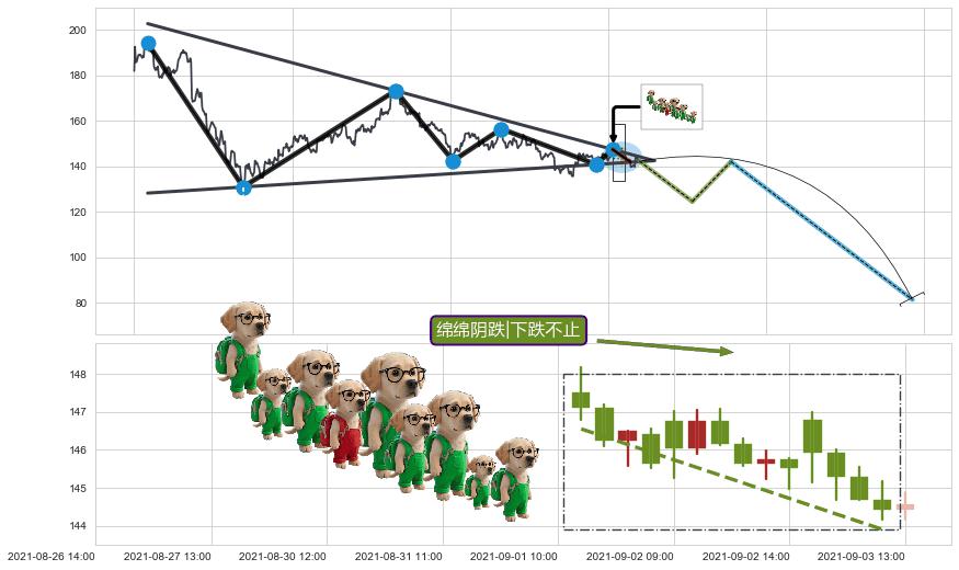 从2021-08-05 11:00至2021-09-09 14:00,共包含148个小时,阶段股价下跌-7.33%,阶段股价变动位移路程比: 1 : 10