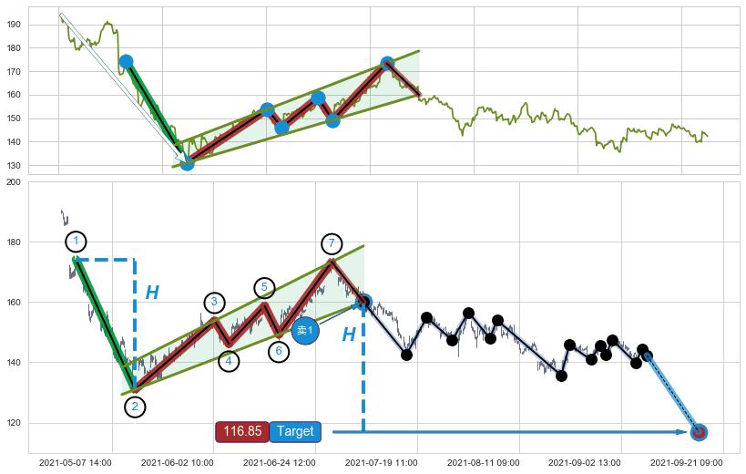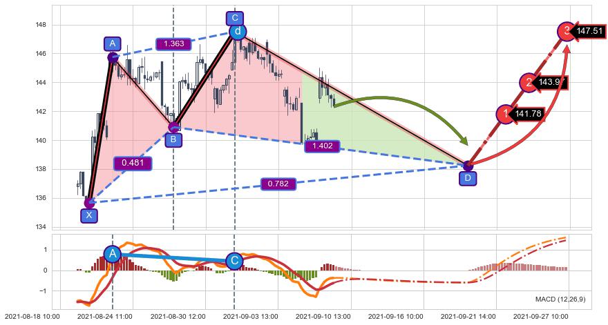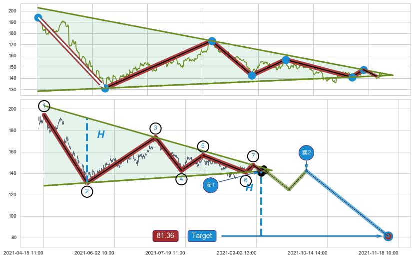 ➣ D点拟合预测价格138.24,距离最后交易收盘价格142.32相差 -2.87%