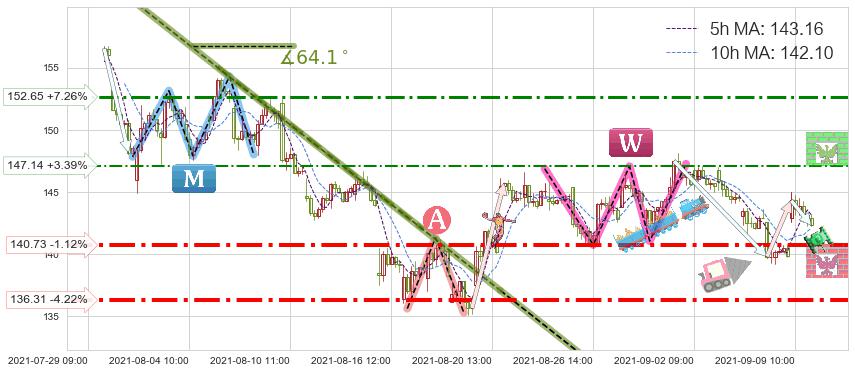 ➣ 【仅预测突破】最后价格:142.32与预测突破价格:139.79→【空间临近】后续最小【反转】第一目标价格→(09-14:13: 133.97 )