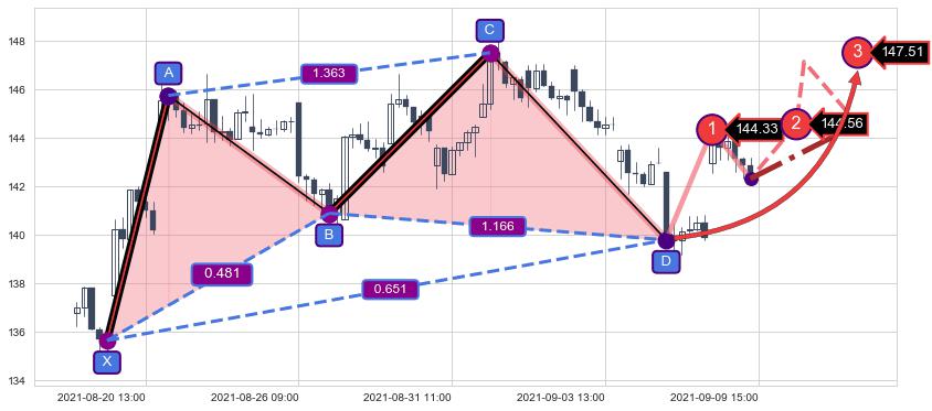 ➣ D点拟合预测价格137.51,距离最后交易收盘价格142.32相差 -3.38%