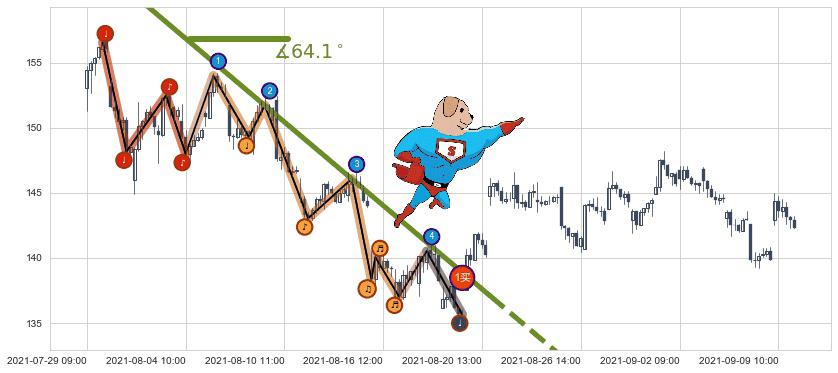从2021-07-29 13:00至2021-08-23 09:00,共包含99个小时,阶段股价下跌-6.81%,阶段股价变动位移路程比: 1 : 9,下跌趋势角度: 64.1