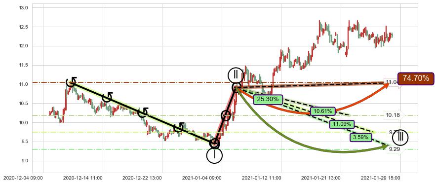 ♘ 支撑价格位10.48,可信任强度94.69%,距离最后交易2021-01-28 16:00形成的收盘价格12.25相差 -14.47%