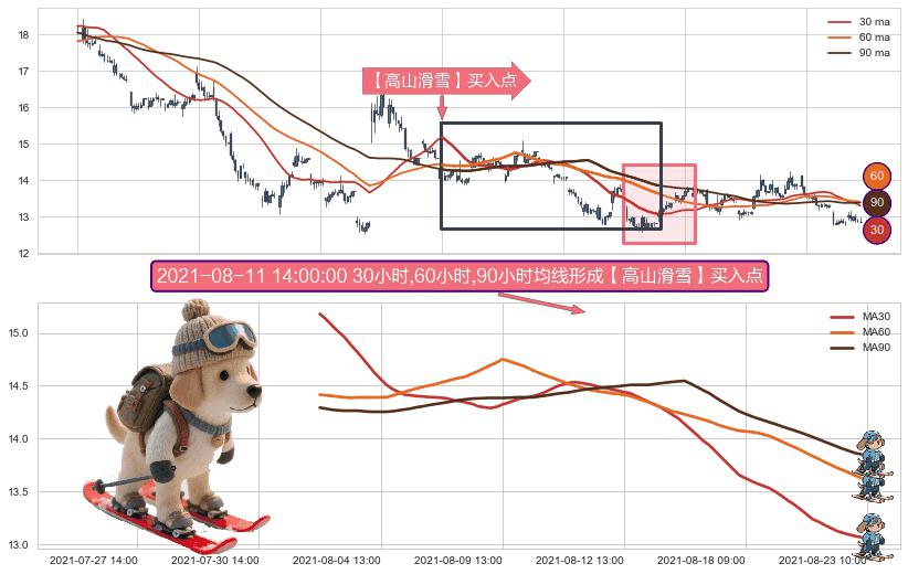 ⚀ 2021-08-03 10:00:00小时-2021-08-23 09:00:00小时显现 30小时-60小时-90小时均线 【高山滑雪】买入点 看多信号,后市看涨,买入