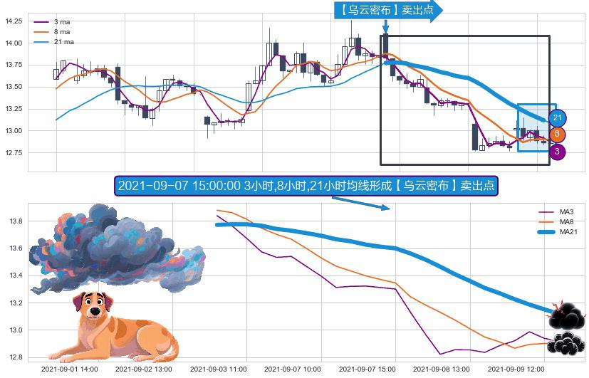⚀ 2021-09-03 09:00:00小时-2021-09-09 13:00:00小时显现 3小时-8小时-21小时均线 【乌云密布】卖出点 看空信号,后市看跌,卖出