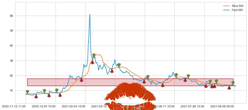 ⚅ 卖点向下突破均线后,价格走势很纠结,不断在均线周围试探,有再次上探突破均线的可能