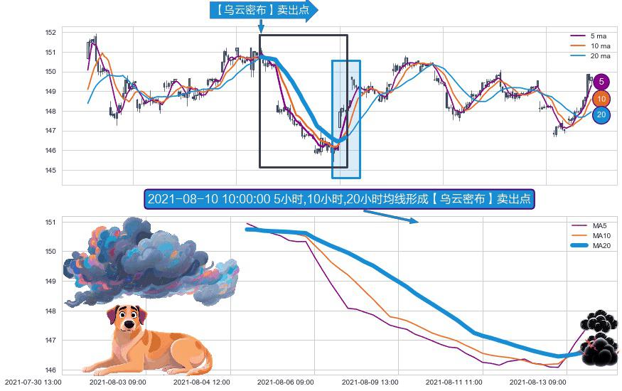 ⚀ 2021-08-04 14:00:00小时-2021-08-13 12:00:00小时显现 5小时-10小时-20小时均线 【乌云密布】卖出点 看空信号,后市看跌,卖出