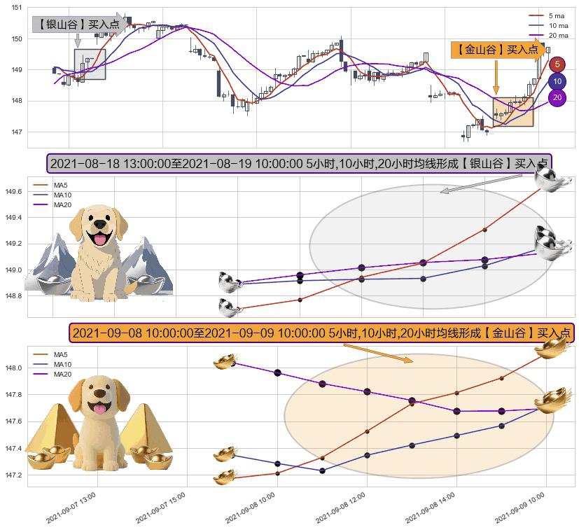 ⚃ 2021-09-08 11:00:00-小时至2021-09-09 10:00:00-小时显现 5小时-10小时-20小时均线 【金山谷】买入点 其再次确认了买入信号,可靠性更强,买入
