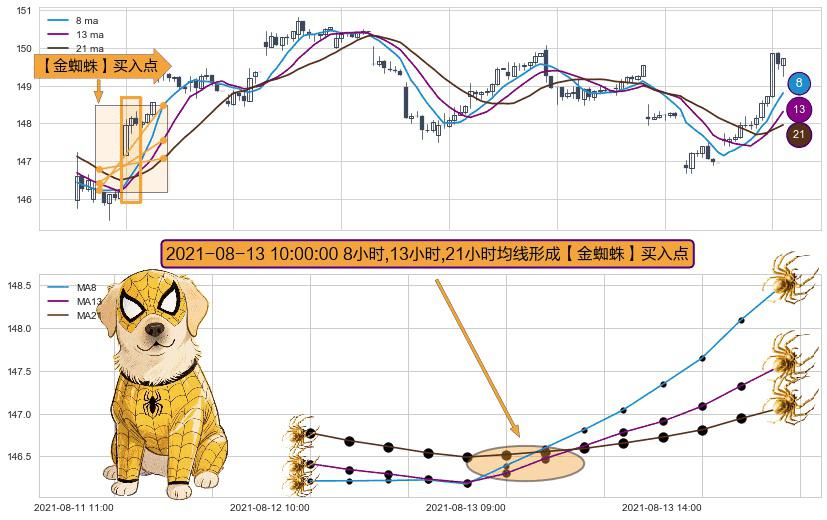 ⚀ 2021-08-13 10:00:00小时显现 8小时-13小时-21小时均线 【金蜘蛛】买入点 看多信号,后市看涨,买入