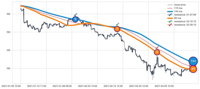 ➢ 最优均线组合共正确确认支撑阻力信号7处,正确确认率 77.78%