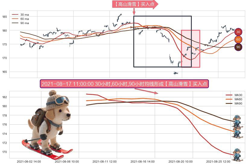 形态多维评估: ⚀ 2021-08-06 14:00:00小时-2021-08-25 14:00:00小时显现 30小时-60小时-90小时均线 【高山滑雪】买入点 看多信号,后市看涨,买入