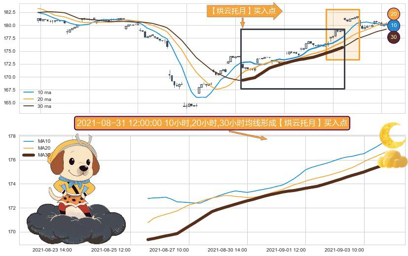 形态多维评估: ⚀ 2021-08-26 09:00:00小时-2021-09-03 14:00:00小时显现 10小时-20小时-30小时均线 【烘云托月】买入点 看多信号,后市看涨,买入