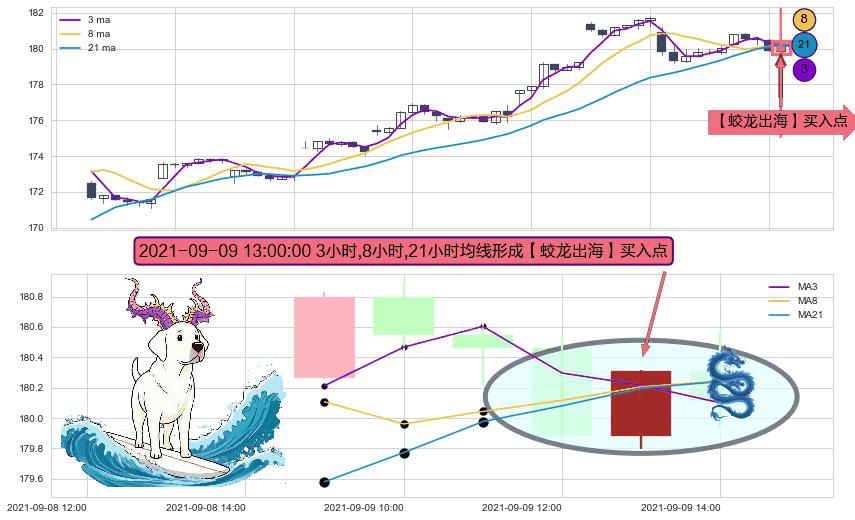 形态多维评估: ⚀ 2021-09-09 13:00:00小时显现 3小时-8小时-21小时均线 【蛟龙出海】买入点 看多信号,后市看涨,买入