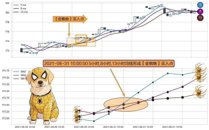 形态多维评估: ⚀ 2021-08-31 10:00:00小时显现 5小时-8小时-13小时均线 【金蜘蛛】买入点 看多信号,后市看涨,买入