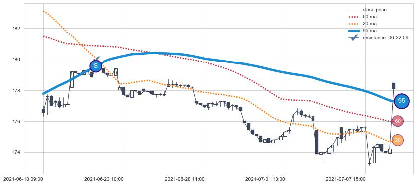 下跌趋势06-18 09:00-07-09 09:00,均线95确认关键阻力1处