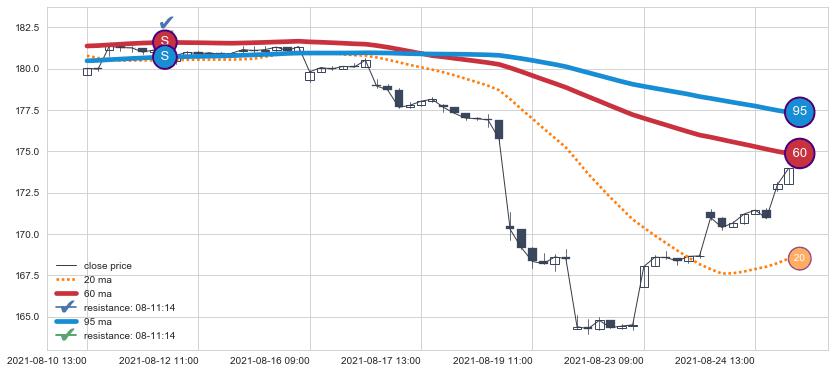 下跌趋势08-10 13:00-08-25 10:00,均线60, 95确认关键阻力1处