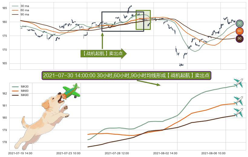 形态多维评估: ⚀ 2021-07-23 13:00:00小时-2021-08-06 14:00:00小时显现 30小时-60小时-90小时均线 【战机起航】卖出点 看空信号,后市看跌,卖出
