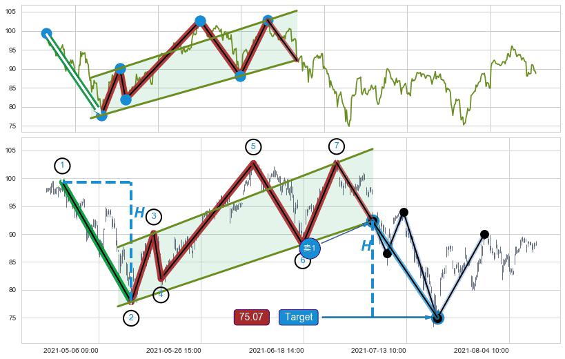 ➣ 最小中继整理跌幅→𝐇: 21.44 (𝐇旗杆的长度:旗杆起点→顶点)