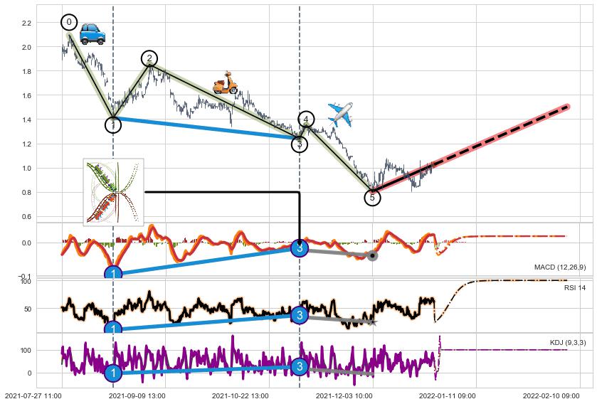 ➢ 1,3,5驱动浪MACD, RSI, KDJ走势都出现【常规背离】反转信号增强
