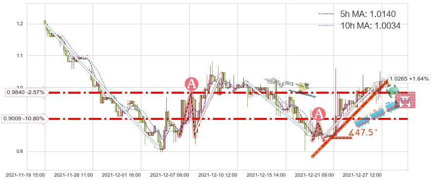 ♘ 支撑价格位0.9009,可信任强度76.44%,距离最后交易2021-12-27 16:00形成的收盘价格1.0100相差 -10.80%