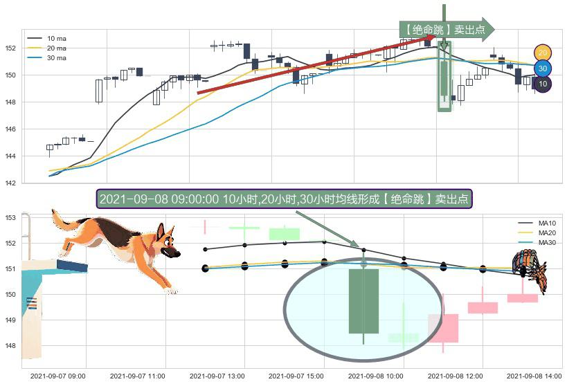 形态多维评估: ⚀ 2021-09-08 09:00:00小时显现 10小时-20小时-30小时均线 【绝命跳】卖出点 看空信号,后市看跌,卖出