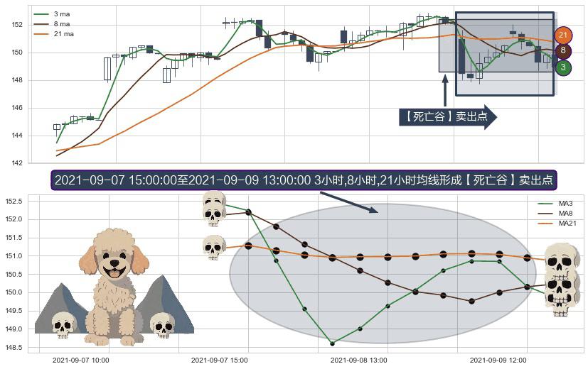 形态多维评估: ⚀ 2021-09-08 09:00:00-小时至2021-09-09 13:00:00-小时显现 3小时-8小时-21小时均线 【死亡谷】卖出点 看空信号,后市看跌,卖出