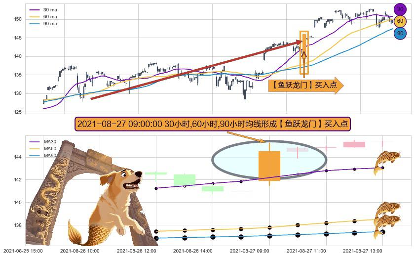 形态多维评估: ⚀ 2021-08-27 09:00:00小时显现 30小时-60小时-90小时均线 【鱼跃龙门】买入点 看多信号,后市看涨,买入