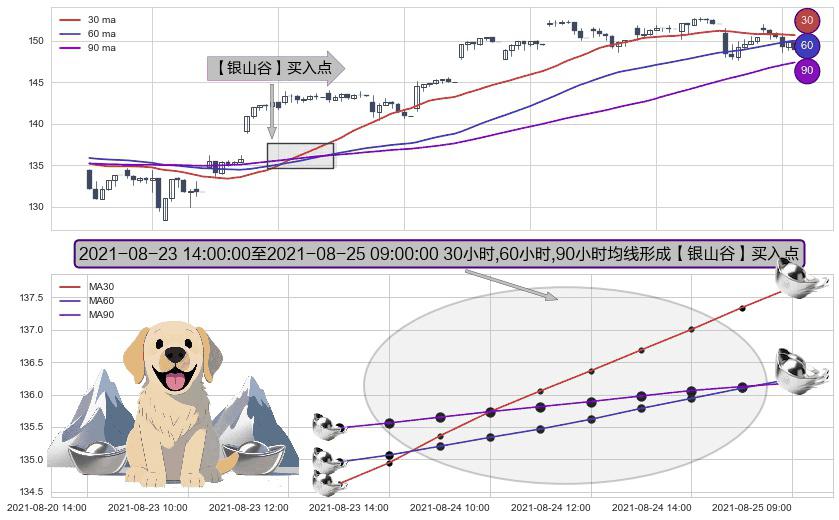 形态多维评估: ⚀ 2021-08-24 09:00:00-小时至2021-08-25 09:00:00-小时显现 30小时-60小时-90小时均线 【银山谷】买入点 看多信号,后市看涨,买入