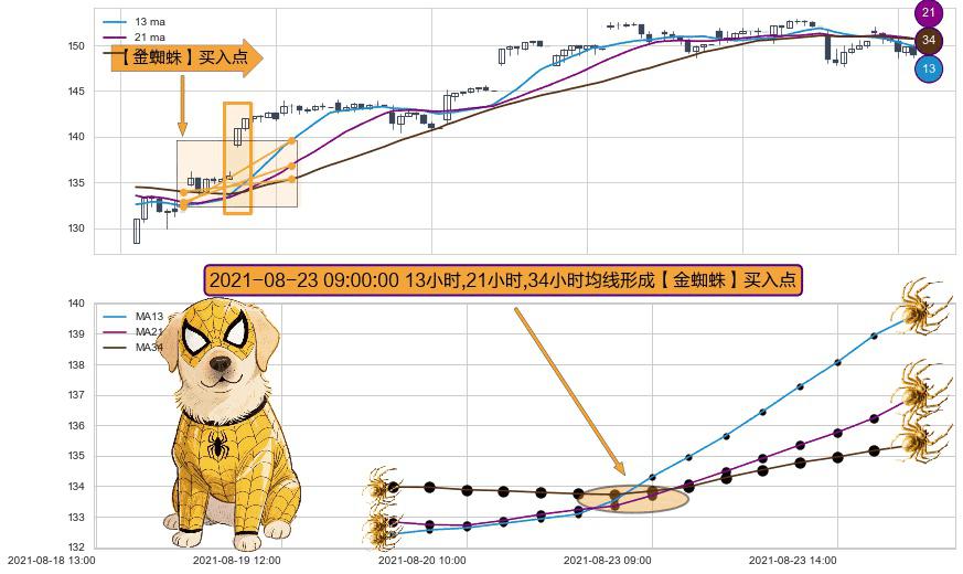 形态多维评估: ⚀ 2021-08-23 09:00:00小时显现 13小时-21小时-34小时均线 【金蜘蛛】买入点 看多信号,后市看涨,买入