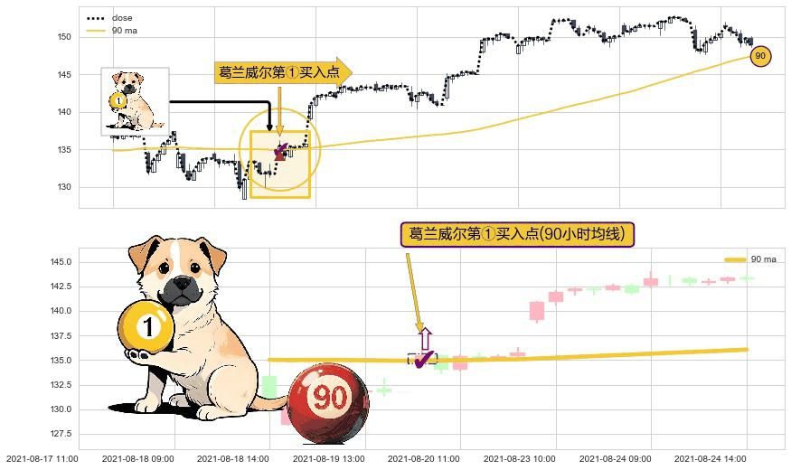 形态多维评估: ⚀ 2021-08-20 09:00:00-小时显现 葛兰威尔均线 90小时均线 第买①入点 走势反转见底信号,后市看涨,买进信号