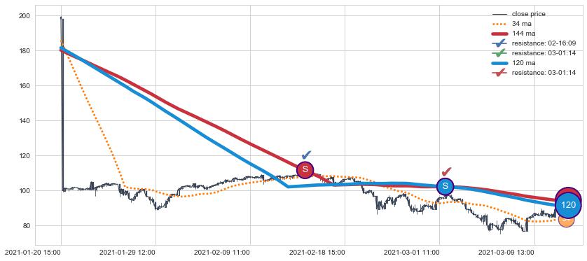 下跌趋势01-20 15:00-03-11 10:00,均线144, 120确认关键阻力2处