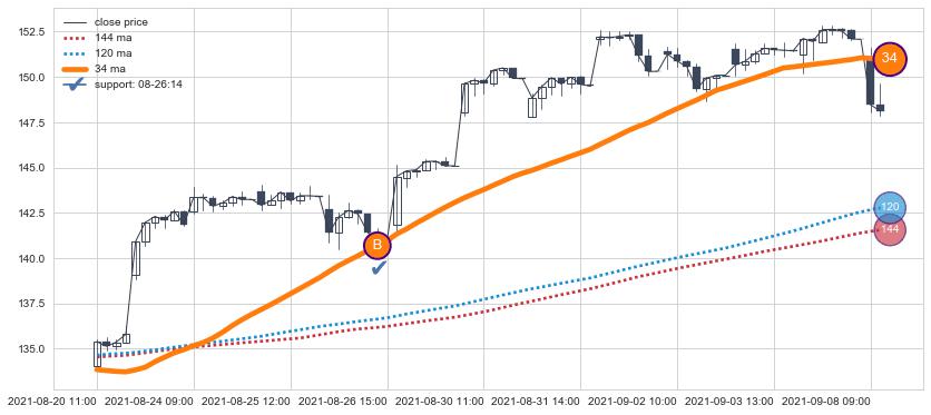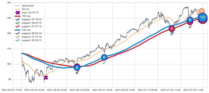 上涨趋势05-03 15:00-07-30 11:00,均线144, 120确认关键支撑4处