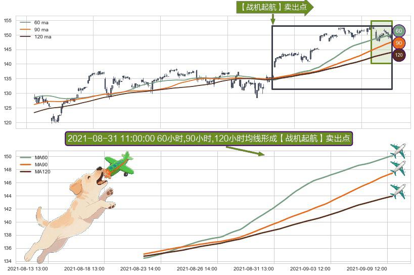 形态多维评估: ⚀ 2021-08-20 14:00:00小时-2021-09-09 14:00:00小时显现 60小时-90小时-120小时均线 【战机起航】卖出点 看空信号,后市看跌,卖出