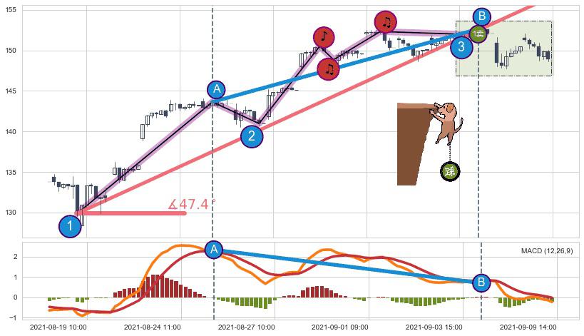 从2021-08-18 14:00至2021-09-08 09:00,共包含91个小时,阶段股价上涨13.69%,阶段股价变动位移路程比: 1 : 3,上涨趋势角度: 47.4