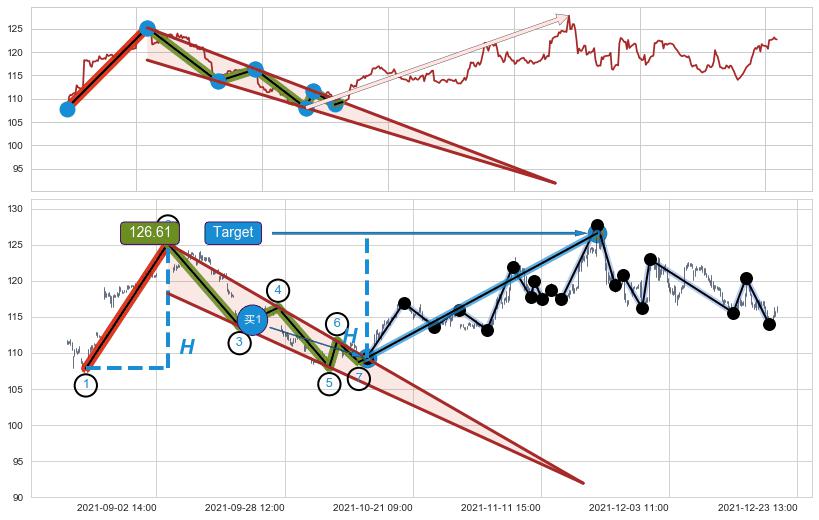 ➢ 最小中继整理涨幅→𝐇: 17.33 (𝐇楔型旗杆的长度:楔型起点→顶点)