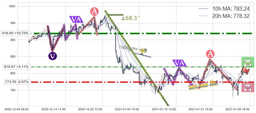 ♘ 支撑价格位773.59,可信任强度71.05%,距离最后交易2021-01-28 16:00形成的收盘价格794.02相差 -2.57%