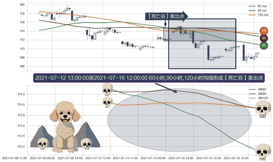 ⚀ 2021-07-12 14:00:00-小时至2021-07-16 12:00:00-小时显现 60小时-90小时-120小时均线 【死亡谷】卖出点 看空信号,后市看跌,卖出