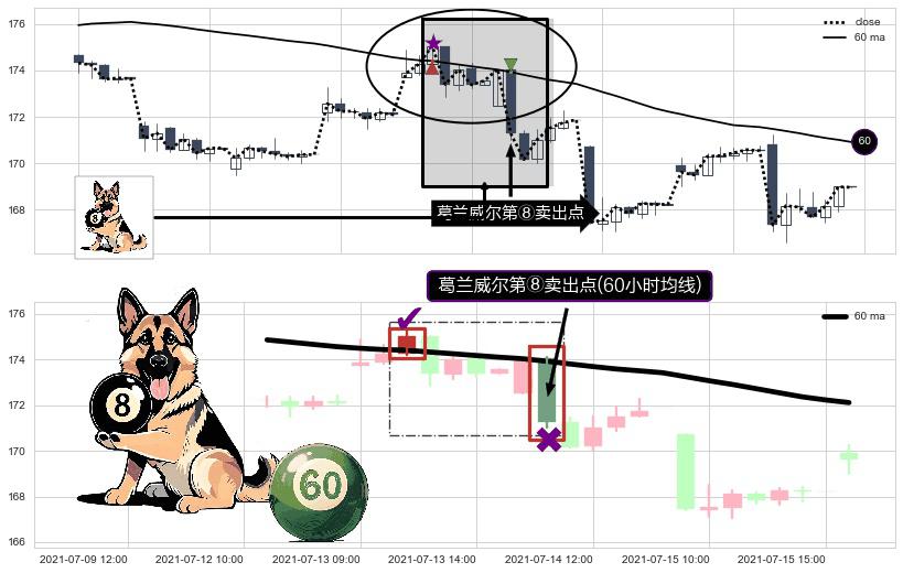 ⚀ 2021-07-14 10:00:00-小时显现 葛兰威尔均线 60小时均线 第⑧卖出点 下降趋势的中继信号,后市看跌,卖出信号