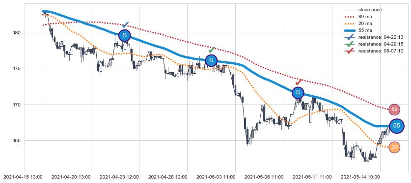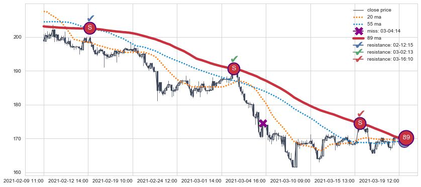 ⚄ 价格在均线遇到阻力后再次向下回落了【较短】距离, 第⑦卖出点 阻力效果【仍需验证】
