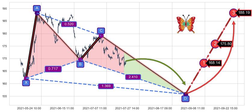 ➢ 距离预测D点位置有足够的下跌空间, 与看涨【蝴蝶】形态相反,实际方向【看跌】