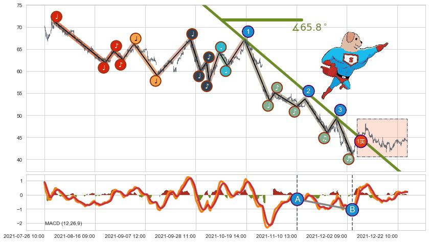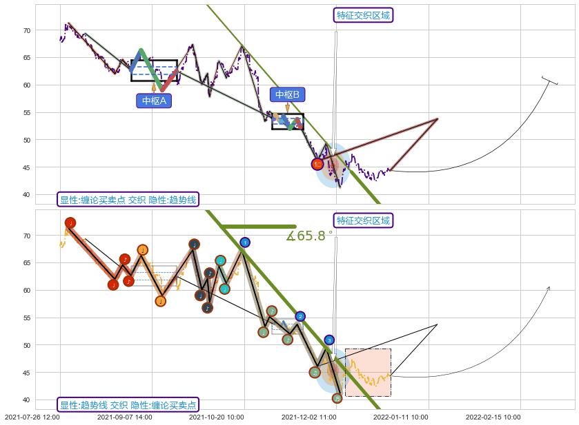 从2021-07-29 11:00至2021-12-08 15:00,共包含615个小时,阶段股价下跌-41.44%,阶段股价变动位移路程比: 1 : 8,下跌趋势角度: 65.8