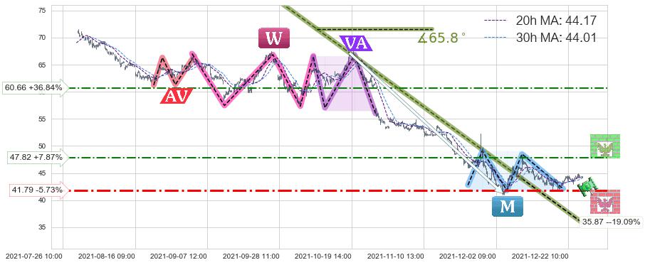 ♘ 支撑价格位41.79,可信任强度55.69%,距离最后交易2021-12-27 15:00形成的收盘价格44.33相差 -5.73%