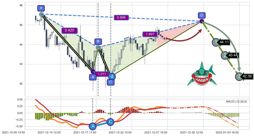 ➣ D点拟合预测价格45.19,距离最后交易收盘价格44.33相差 +1.93%