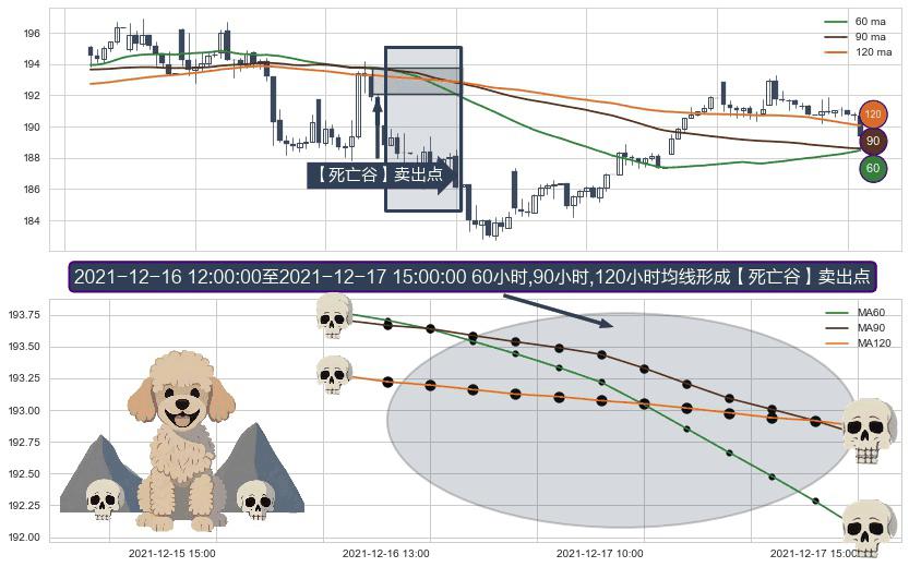 形态多维评估: ⚀ 2021-12-16 13:00:00-小时至2021-12-17 15:00:00-小时显现 60小时-90小时-120小时均线 【死亡谷】卖出点 看空信号,后市看跌,卖出