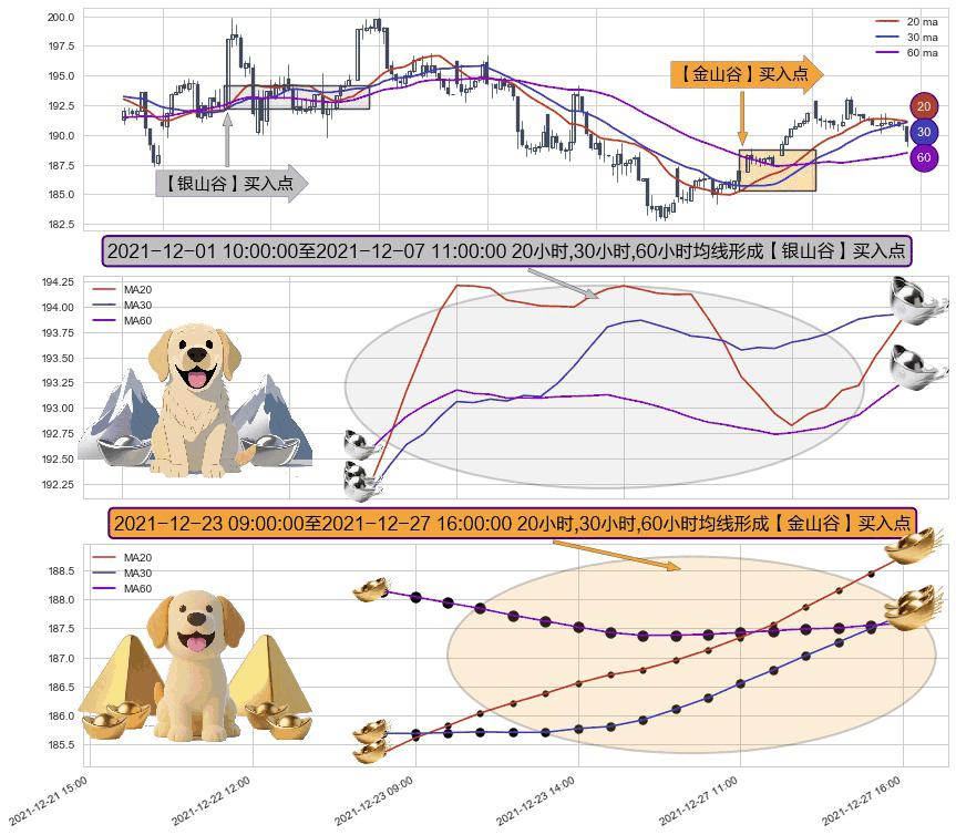 ⚃ 2021-12-23 10:00:00-小时至2021-12-27 16:00:00-小时显现 20小时-30小时-60小时均线 【金山谷】买入点 其再次确认了买入信号,可靠性更强,买入