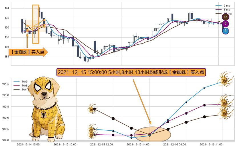 形态多维评估: ⚀ 2021-12-15 15:00:00小时显现 5小时-8小时-13小时均线 【金蜘蛛】买入点 看多信号,后市看涨,买入