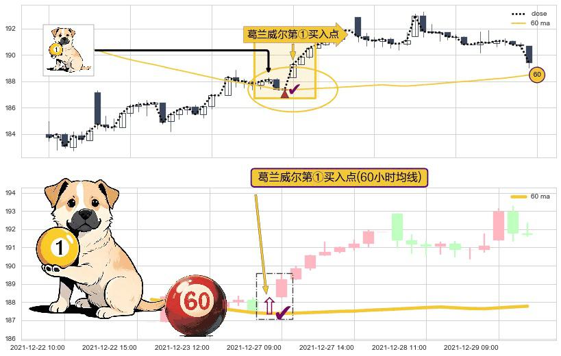 形态多维评估: ⚀ 2021-12-23 16:00:00-小时显现 葛兰威尔均线 60小时均线 第买①入点 走势反转见底信号,后市看涨,买进信号