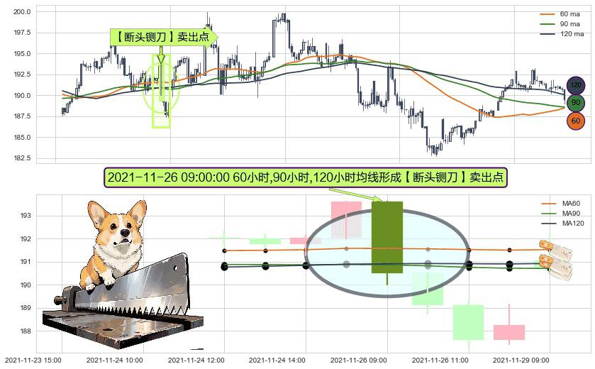 形态多维评估: ⚀ 2021-11-26 09:00:00小时显现 60小时-90小时-120小时均线 【断头铡刀】卖出点 看空信号,后市看跌,卖出